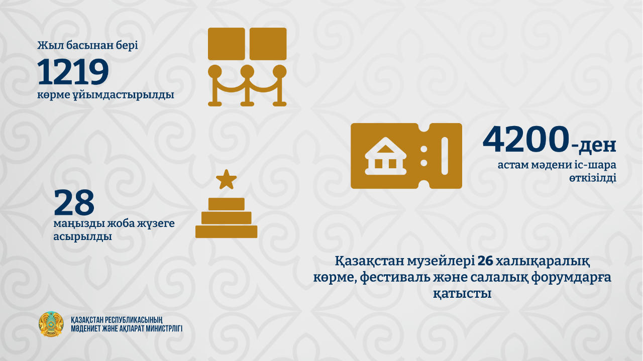 Сонымен қатар көрме және ағартушылық бағыттағы жұмыстар да қарқын алуда. Жыл басынан бері 1219 көрме ұйымдастырылып, жаңа экспозициялар мен тақырыптық залдар ашылды, 4200-ден астам мәдени-ағартушылық іс-шара өткізілді. Олардың қатарында дәрістер, экскурсиялар, білім беру бағдарламалары мен интерактивті жобалар бар.