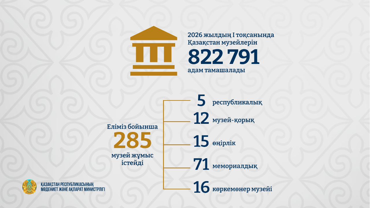 Қазақстанда музей мәдениетіне қызығушылық артып келеді. 2026 жылдың алғашқы үш айының қорытындысы бойынша ел музейлерін 822 791 адам тамашалаған. Мұндай көрсеткішке музей инфрақұрылымын дамыту, экспозицияларды жаңарту және көпшілікке, әсіресе жастар мен туристерге арналған заманауи форматтарды енгізу жұмыстарының нәтижесінде қол жеткізілді.