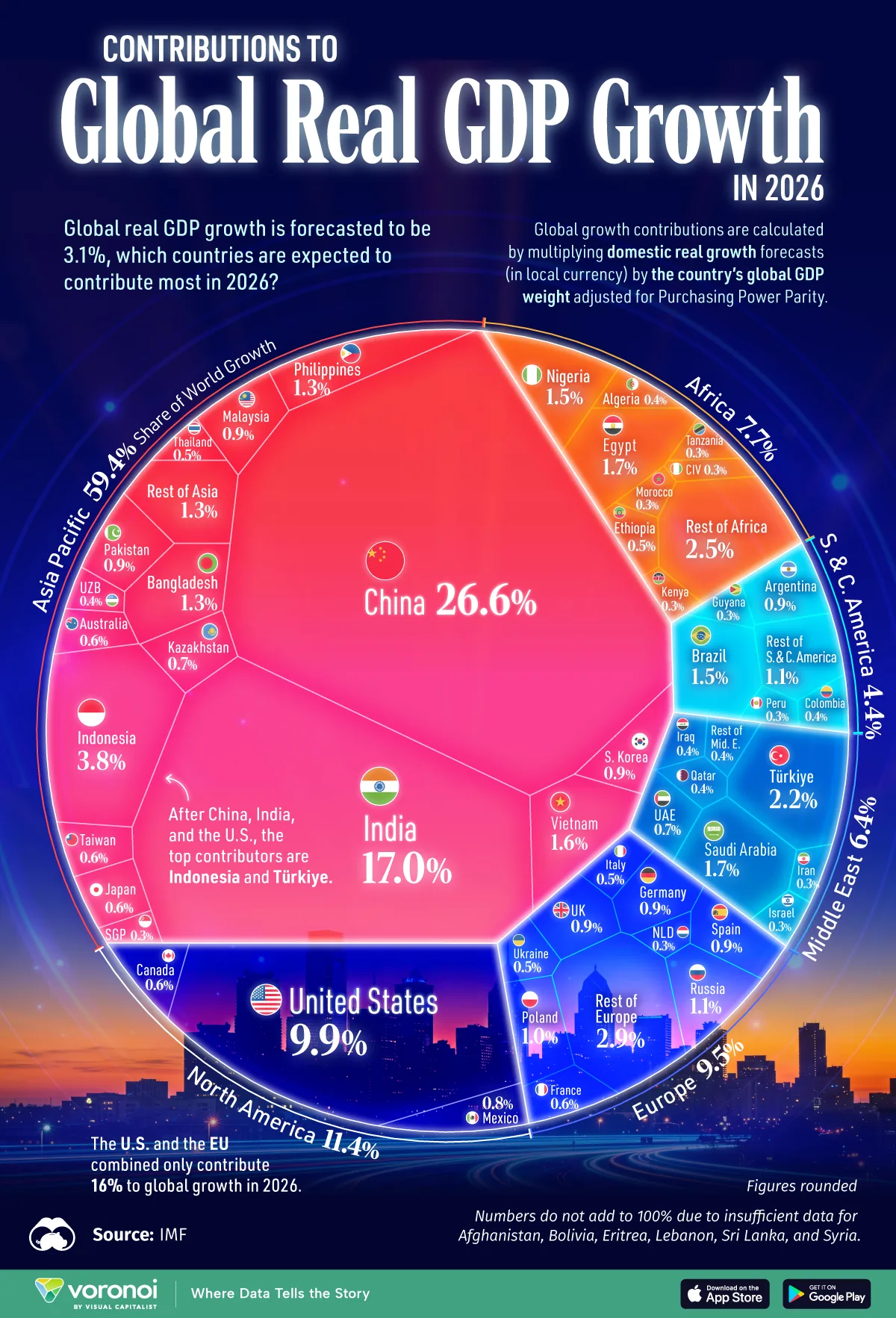 Қытай 2026 жылы жаһандық нақты ЖІӨ өсімінің 26,6%-ын қамтамасыз етеді. Ел экономикасы 4,2%-ға ұлғаяды деп күтіледі. Өсім қарқыны бұрынғы жылдармен салыстырғанда баяулағанымен, Қытай экономикасының көлемі үлкен болғандықтан, оның әлемдік өсімдегі рөлі басым.