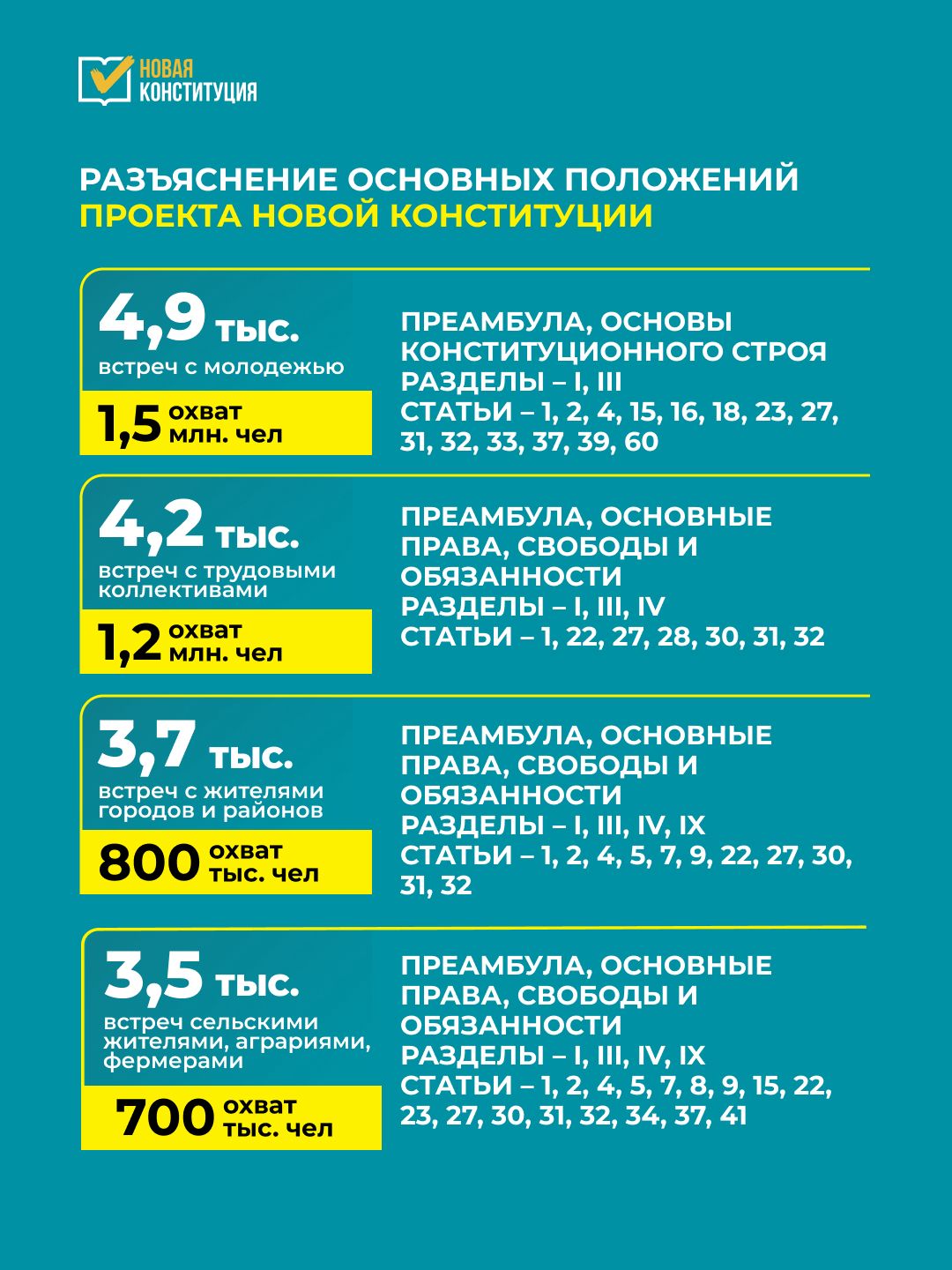 Мероприятия проходили во всех регионах страны – в городах и сельских населённых пунктах, на предприятиях, в образовательных учреждениях и общественных площадках. Основная цель кампании – подробно рассказать гражданам о ключевых положениях проекта Конституции и ответить на возникающие вопросы.