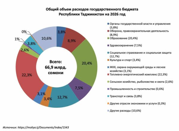 Кыргызстан остается предпринимательским — 36% расходов идет на экономическое развитие, при этом доля социальных направлений (28,8%) тоже значительна. Бюджет небольшой, но гибкий — страна пробует расти через инвестиции и международную помощь. Таджикистан, напротив, делает ставку на энергию и инфраструктуру (22%) при сохранении почти половины бюджета (47%) на социальные цели. Это курс на выживание и долгосрочную автономию, где энергетика становится ядром экономики.