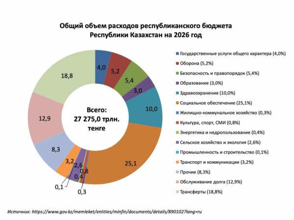 Казахстан в 2026 году демонстрирует сбалансированную и зрелую модель фискального управления. Расходы составляют 27,3 трлн тенге (14,8% ВВП), из которых 39% направлены на социальные цели. Это бюджет технократического государства в каком-то смысле — социальная поддержка (25%), здравоохранение (10%), образование и культура (15%) формируют основу для устойчивого роста. Казахстан судя по бюджету управляет человеческим капиталом.