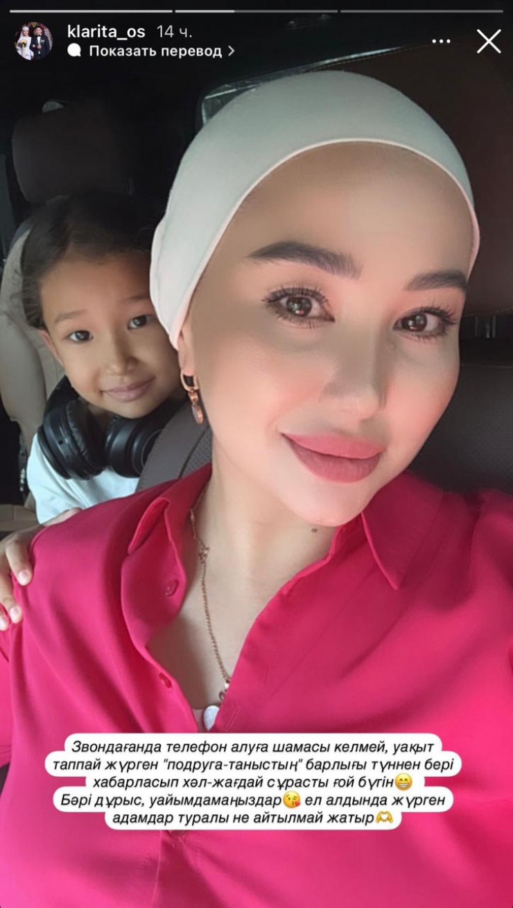 «Хабарласқанда телефон алуға шамасы келмей, уақыт таппай жүрген «құрбы-таныстың» бәрі түннен бері хабарласып, жағдайымды сұрады ғой. Бәрі дұрыс, уайымдамаңыздар. Ел алдында жүрген адамдар туралы не айтылмай жатыр?», — деп жазды Клара Иса.