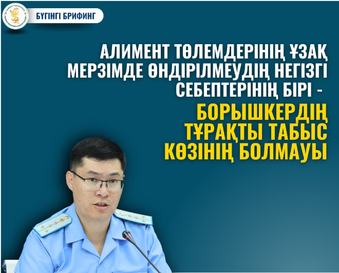 Ол: «Қаламызда алимент төлеуден жалтарып жүрген борышкерлер саны азаймауда, бүгінгі күнде осындай әкелердің саны 2913-ке жетіп олардың алимент берешегі 3 млрд 807 млн теңгегі құраған. Осы төлемдердің ұзақ мерзімде өндірілмеудің негізгі себептерінің бірі — борышкердің тұрақты ресми табыс көздерінің болмауынан және тұрғылықты мекенжайының анықталмауы, яғни, борышкерлердің іздеуде болуы»,-деді.