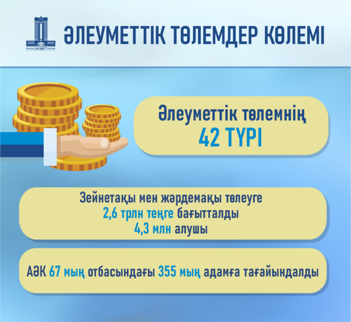 Республикалық бюджет қаражаты есебінен базалық және ортақ зейнетақыны қоса алғанда, әлеуметтік төлемдердің 42 түрі төленеді. Биылғы 6 айда 4,3 млн адамға: оның ішінде 2,4 млн зейнеткер мен 1,9 млн мемлекеттік жәрдемақы алушыға зейнетақы және жәрдемақы төлеуге 2,6 трлн теңге бөлінді. 2024 жылғы 1 шілдедегі жағдай бойынша өмірлік қиын жағдайға тап болған 67 мың отбасының 355 мыңнан астам адамына атаулы әлеуметтік көмек тағайындалды.