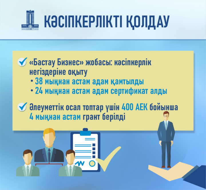 315 мыңнан астам қазақстандық жұмыспен қамтуды белсенді қолдау шараларымен қамтылған. 231 мыңға жуық адам жұмысқа орналастырылса, оның 98 мыңға жуығы тұрақты жұмыс орнына ие болды. Еңбек нарығында сұранысқа ие дағдылар бойынша 36 мыңнан астам жұмыссыз азамат онлайн білім алса, оның 33 мыңға жуығы оқуын аяқтады. «Бастау Бизнес» жобасы аясында 38 мыңнан астам адам кәсіпкерлік негіздеріне оқытылды, 24 мыңнан астамы оқуын аяқтап, сертификаттар алды. 110 мыңнан астам қазақстандық қызмет саласын таңдау бойынша әлеуметтік кәсіптік бағдарлаудан өтті. Сонымен қатар жаңа бизнес-бастамаларды іске асыру үшін халықтың әлеуметтік осал санаттарына жататын азаматтарға 400 АЕК мөлшерінде 4 мыңнан астам грант берілді.